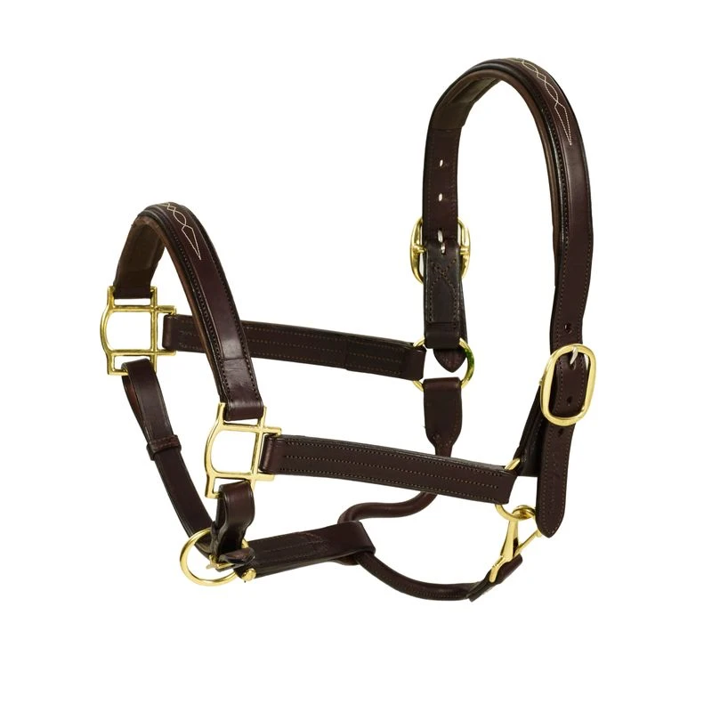 Features carefully picked top grain cowhide leather, leather padded nose and crown, double buckle crown piece, adjustable chin, and throat snap. Hardware is solid brass.