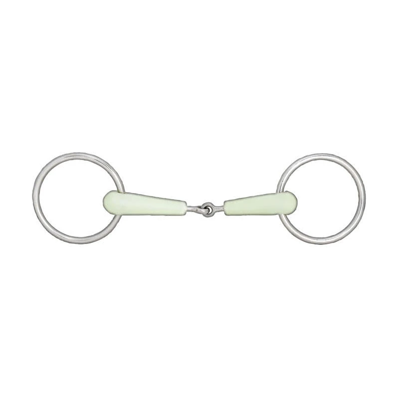 The synthetic apple-flavored mouthpiece is readily accepted by most horses and is lighter and thinner than rubber. A standard single jointed mouthpiece provides control by collapsing onto the horse’s tongue and bars when pressure is applied to the reins. Loose ring style cheekpieces discourage the horse from leaning on the bit and assist the horse in learning self carriage. This bit is legal for most dressage classes.
