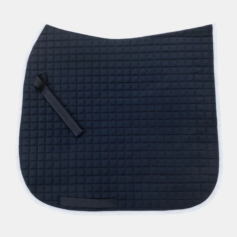 Quality and style are combined to keep your horse comfortable in the Horze Toulouse All Purpose Saddle Pad. A beautiful diamond quilt pattern, moisture wicking capabilities, and impeccable attention to detail set this pad apart from others. This pad acts as a protective barrier between the saddle and horses back. Luxuriously soft, breathable honeycomb lining combined with an ergonomic shape ensures a secure fit to eliminate rubbing and friction and will accommodate the horse’s natural shape. High-density quilting provides shock-absorbing protection, cooling, and moisture wicking action for a comfortable, relaxed horse. Extra relief through the wither area adds increased comfort with a reinforced nylon girth strap and billet hook and loop fasteners for easy use. Not only functional this is visually appealing as well. Double cord trim, in matching colors, wrap the entire pad giving it a refined, rich look.