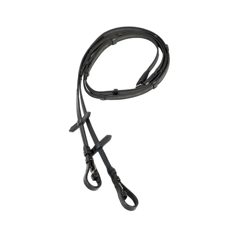 A great choice for training rides, these reins are light and flexible in the hand. For added grip, these web reins also feature hand stops. Easily switch between bits with the buckle ends. For use with a martingale, these reins also offer integrated rein stops. No more struggling with adding rubber rein stops! Features quality leather with stainless steel for plenty of durability.