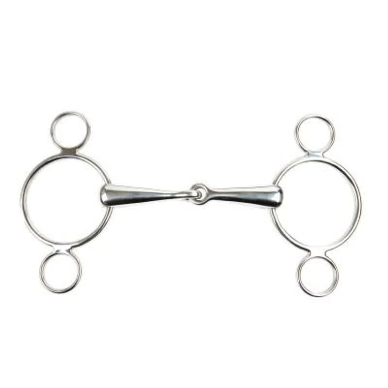The Korsteel Solid Jointed Mouth 3 Ring Continental Gag Bit is a cross between a pelham and a gag.
