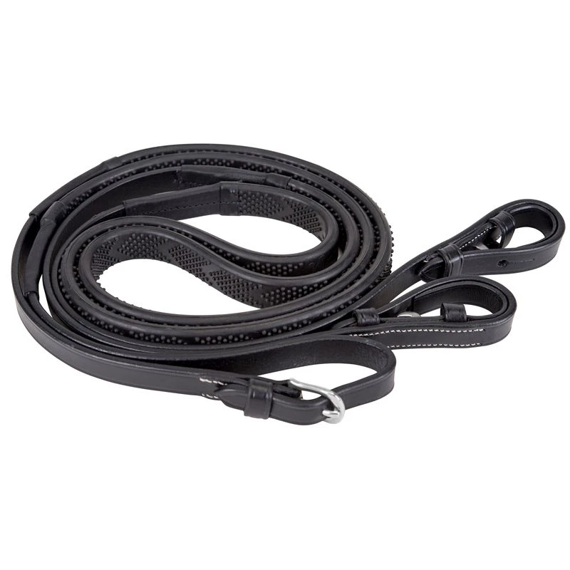 The Flat Leather Rubber Covered Reins are made with imported European leather and features hook stud ends. Black.