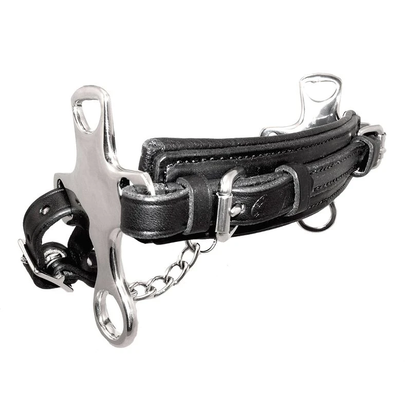 The Crossroad Hackamore is designed with a noseband that follows the natural contours of the horses face with wide, soft padding to ensure comfort. Crafted for optimum performance, this hackamore also looks stunning with stainless steel shank cheekpieces, an American made premium leather nosepiece and chin strap, and your choice of a leather or chain curb.