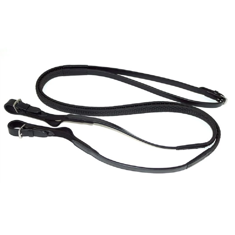 The loop of the elastic is limited to the stretch due to the leather backed loop. Created in beautiful Italian leather featuring soft grip rein grip. These reins are sure to become a favorite!