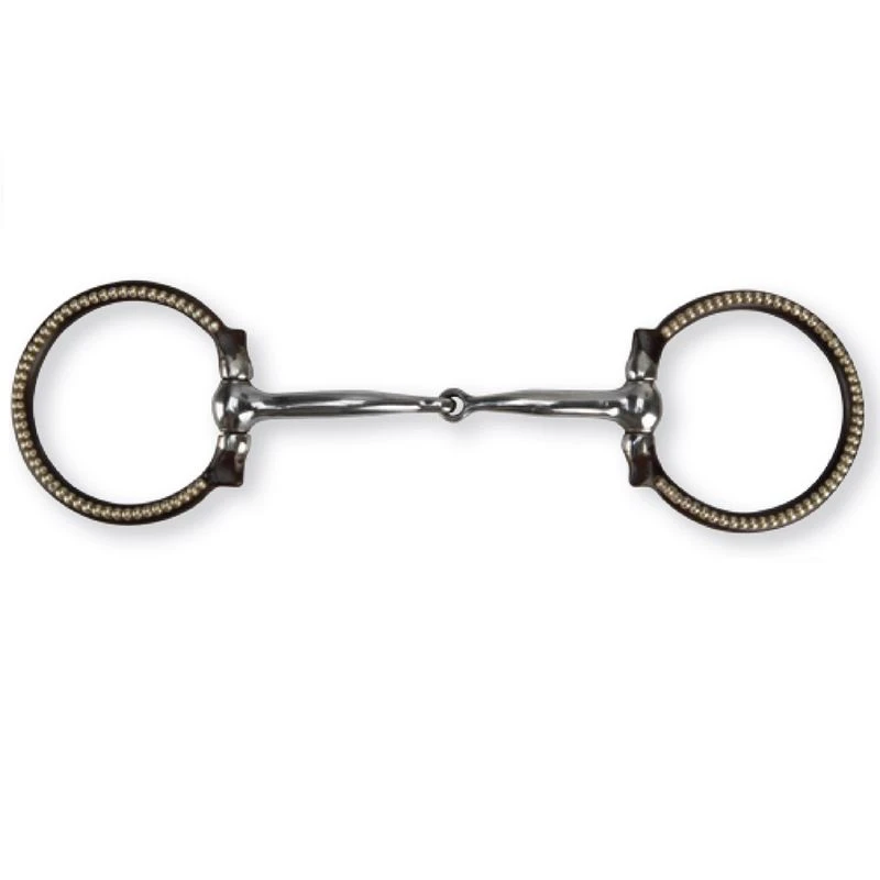 This bit has antique brown Western Dee cheeks and traditional single joint snaffle mouth.