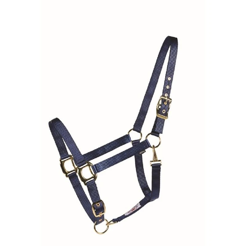 A glossy nylon halter available in a variety of colors and with 2 ply construction and brass plated zinc die cast hardware.