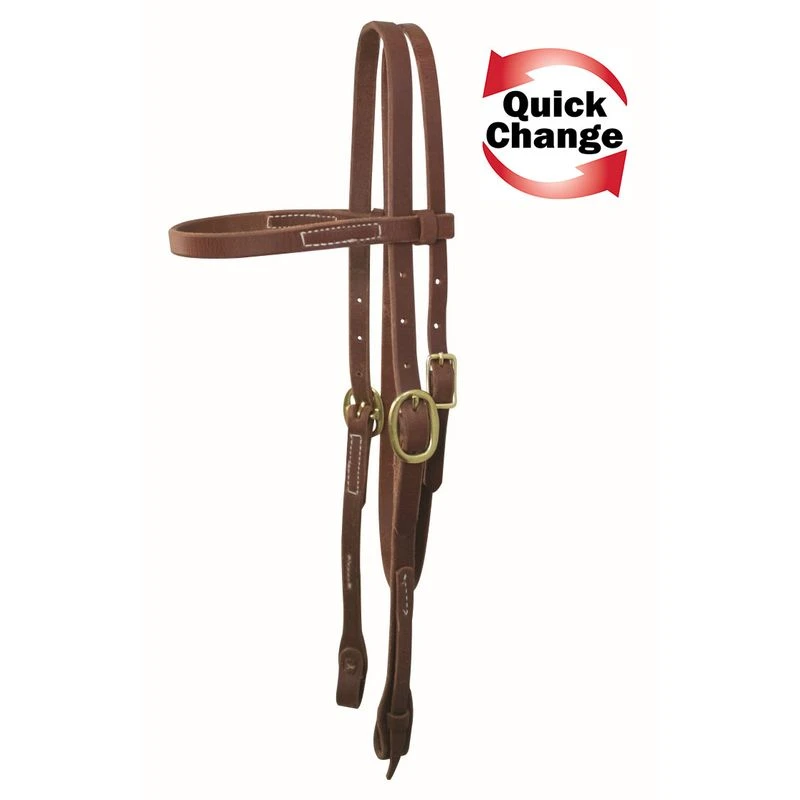 Oiled Harness leather headstall with Quick change System attachments and solid brass buckles.